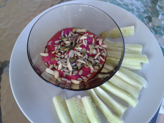 Directas desde nuestro huerto ecológico están llegando las remolachas y nuestra jefa de producción, Esther G., esta semana se ha sentido inspirada por las propuestas de un blog amigo: Deliciosamente Sano y ha querido compartir con todos vosotros su particular receta de Hummus de remolacha con crudités de pepino, aportándole todo el toque ecológico de nuestras verduras.