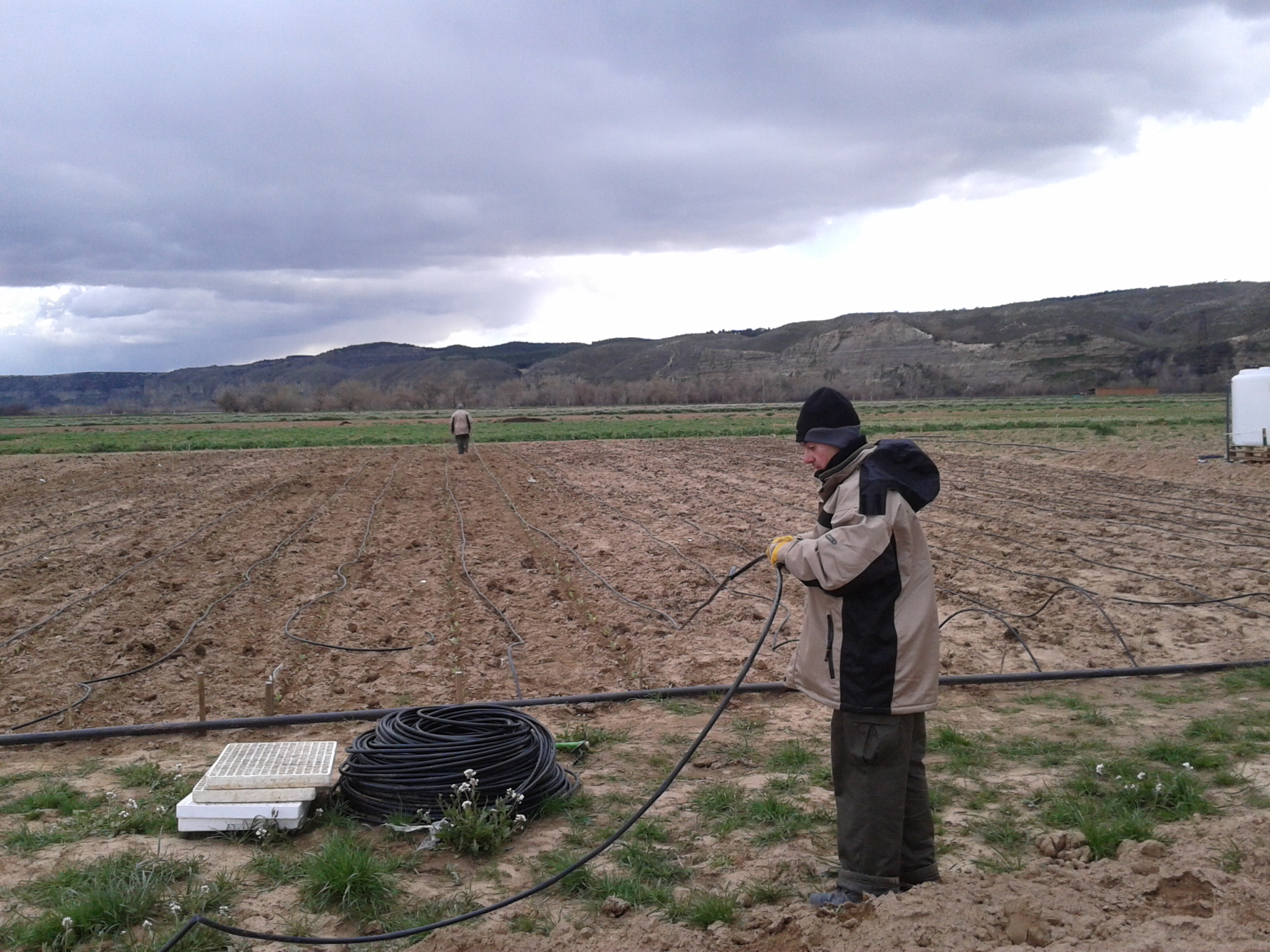 Adelantándonos a la llegada del buen tiempo, estos días estamos instalando el riego en las zonas de la parcela donde ya tenemos plantas. Las mangueras de goteo, que se cortaron previamente, se están colocando en las filas de cultivos y enganchando a la tubería principal. El riego por goteo permite ahorrar agua y utilizar de forma sostenible este recurso.