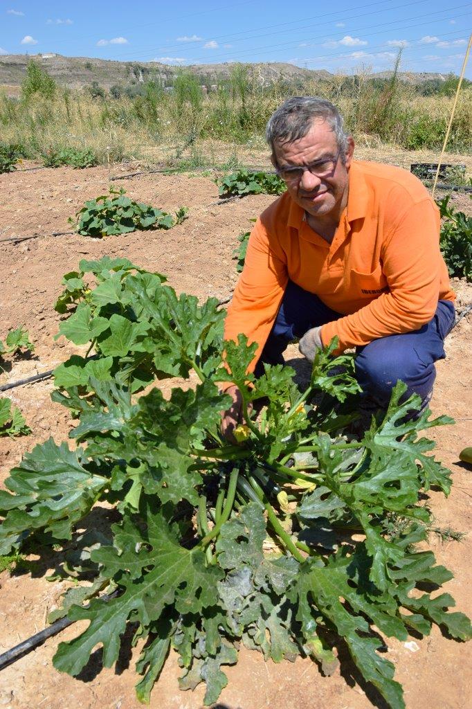 Manuel recolectando flores de calabacín.