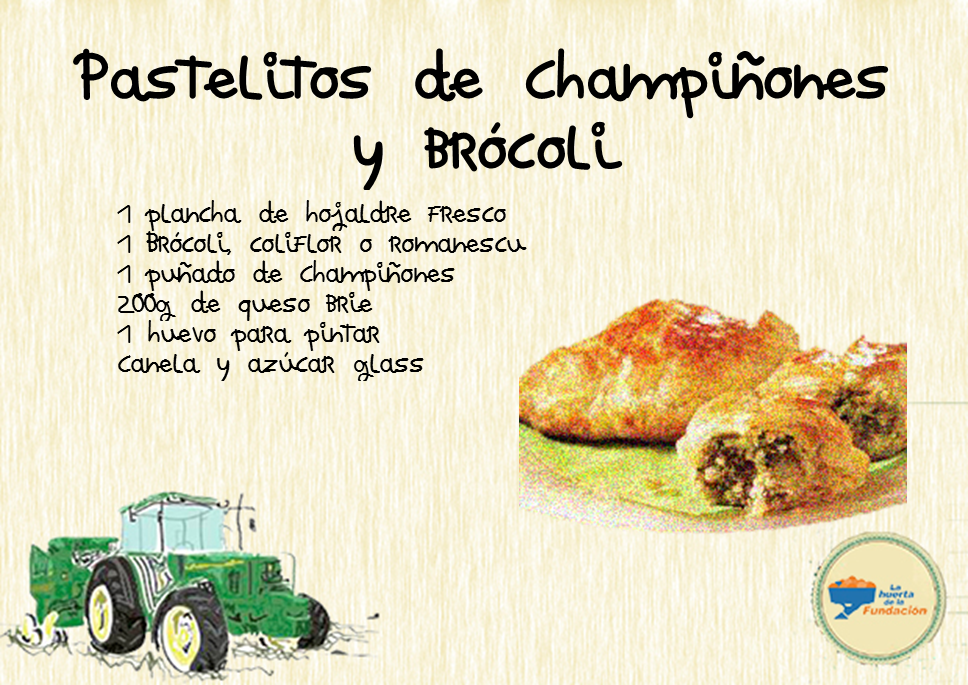 Home > Blog Pastelitos de champiñones y brócoli 20/02/2014 | Discapacidad , Eco-recetas , Ecorecetas , Cestas ecológicas a domicilio , huerto ecologico , La huerta de la fundación por José Antonio Morena Pardo La receta de esta semana está dedicada a aquellos que os está costando un poco los de las verduras de temporada, ¡¡daos un premio la semana que viene!!