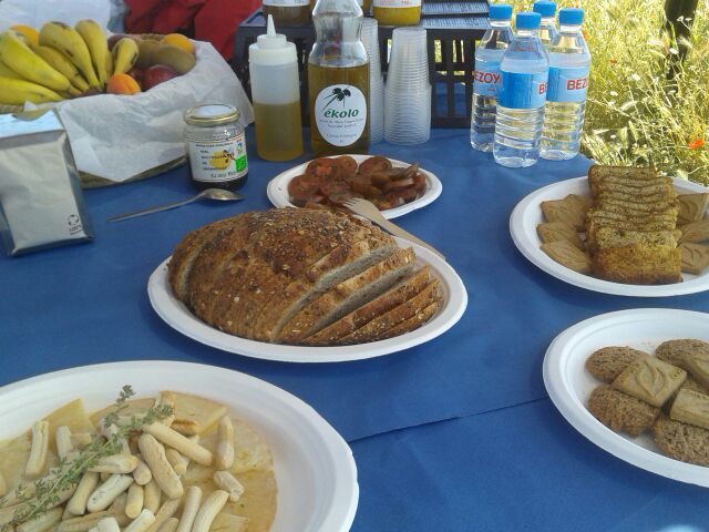 Festejamos el buen trabajo realizado con un almuerzo ecológico para rehidratarnos, cargarnos de vitaminas y energía. Tuvimos la oportunidad de degustar distintos alimentos y frutas de nuestras cestas ecológicas y de charlar e intercambiar ideas sobre la agricultura ecológica, el proyecto y la experiencia de la jornada.