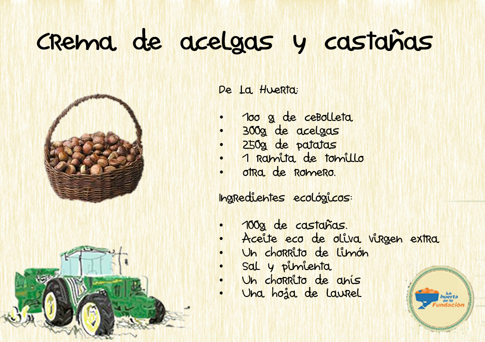 Cuece 30 min las castañas con una incisión, con un chorrito de anís, una hojita de laurel y un pellizquito de sal. Escúrrelas y déjalas reposar cubiertas con un trapo. Sofríe las patatas, las acelgas y la cebolla de nuestro huerto ecológico, con el aceite y un chorrito de limón. Añade las castañas (guardamos 4), el romero, el tomillo y 1l de agua y dejas hervir 25 min. Tritura hasta encontrar la textura deseada y corrige a tu gusto con pimienta y sal. Sírvelo decorado con una castaña. ¡Buen provecho!