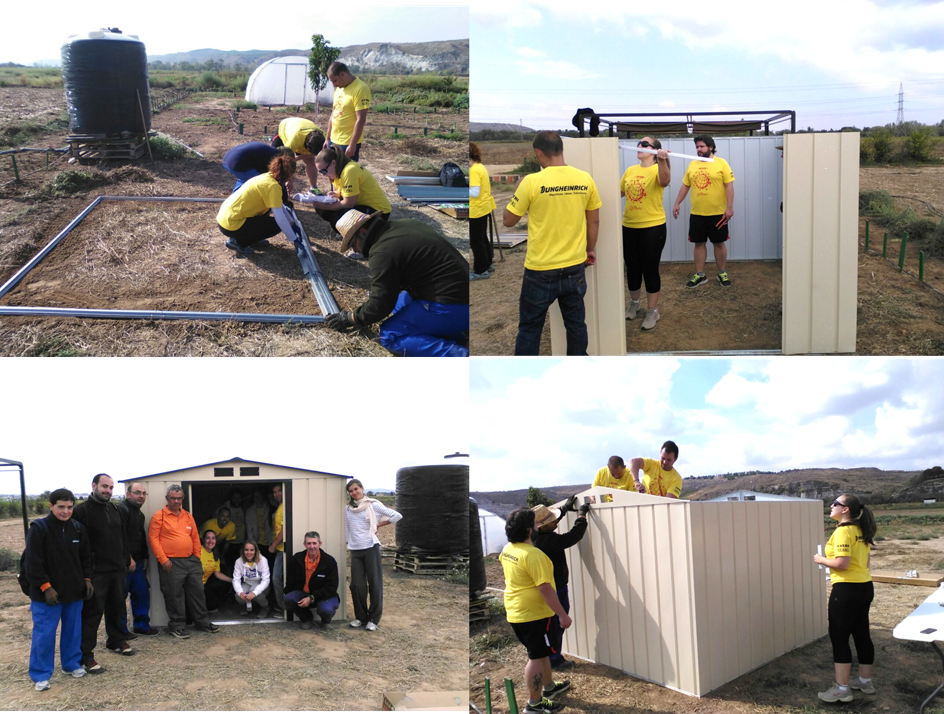 Trabajo en equipo DHL en nuestro huerto ecológico, instalación caseta